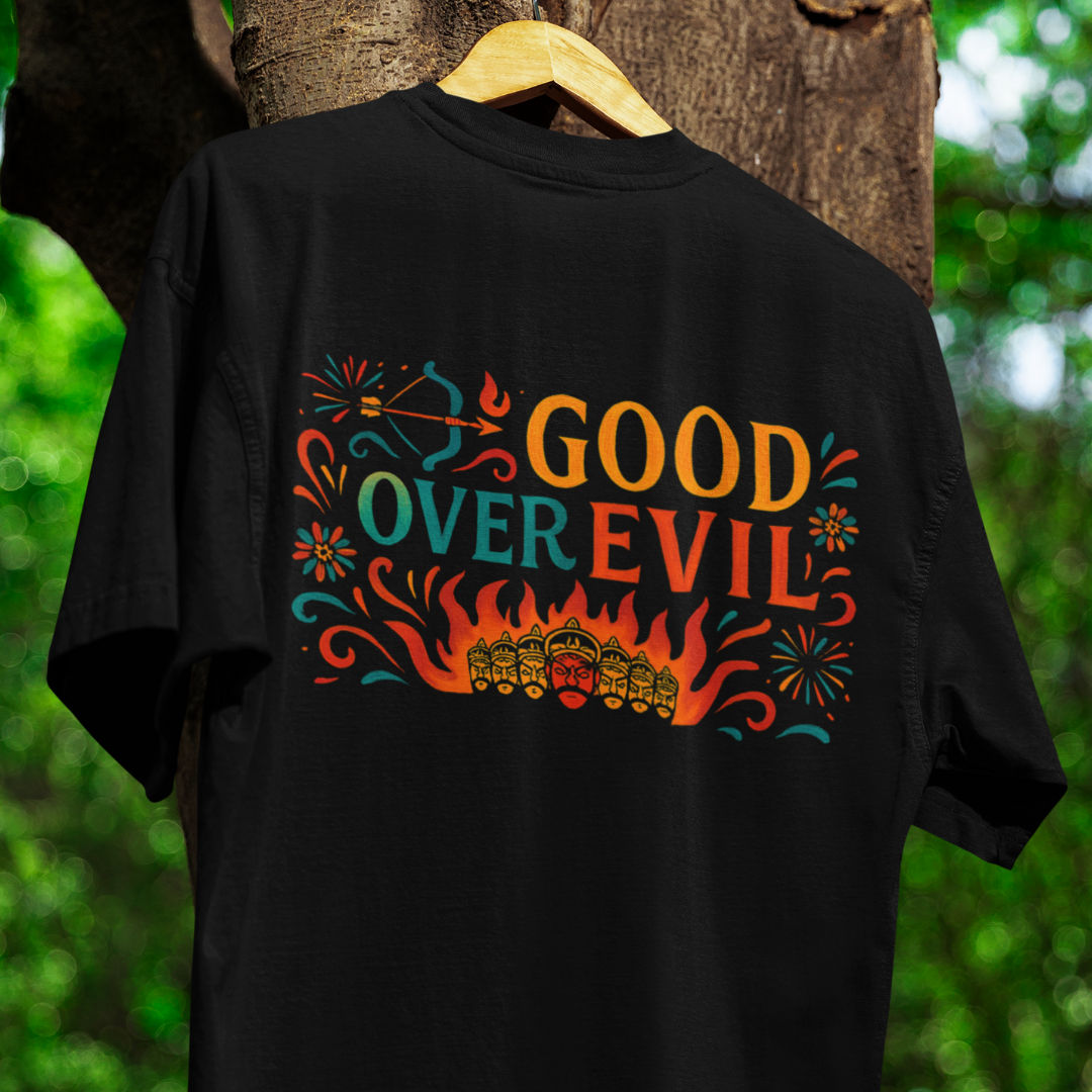 रावण के दस सिरों को दर्शाती यह टीशर्ट याद दिलाती है कि असली लड़ाई अंदर की होती है। हर सिर एक आधुनिक दोष—ईगो, लालच, क्रोध। इस दशहरा, खुद को जीतने का जज़्बा पहनिए।