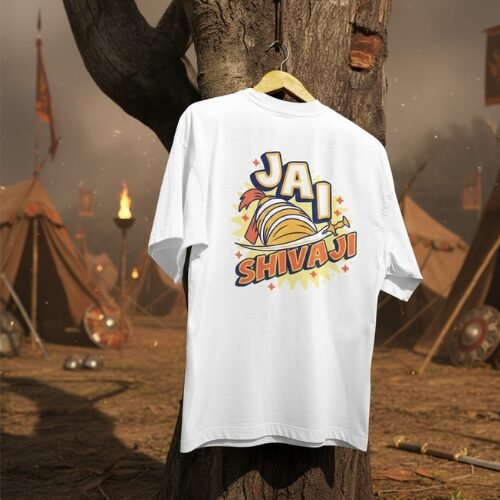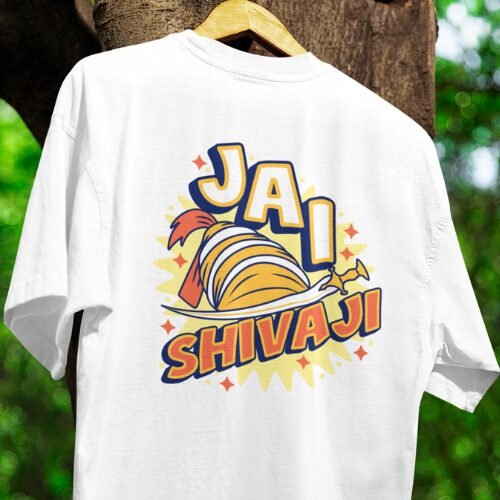 Featuring a warrior helmet and bold “JAI SHIVAJI” text, it radiates pride and power.